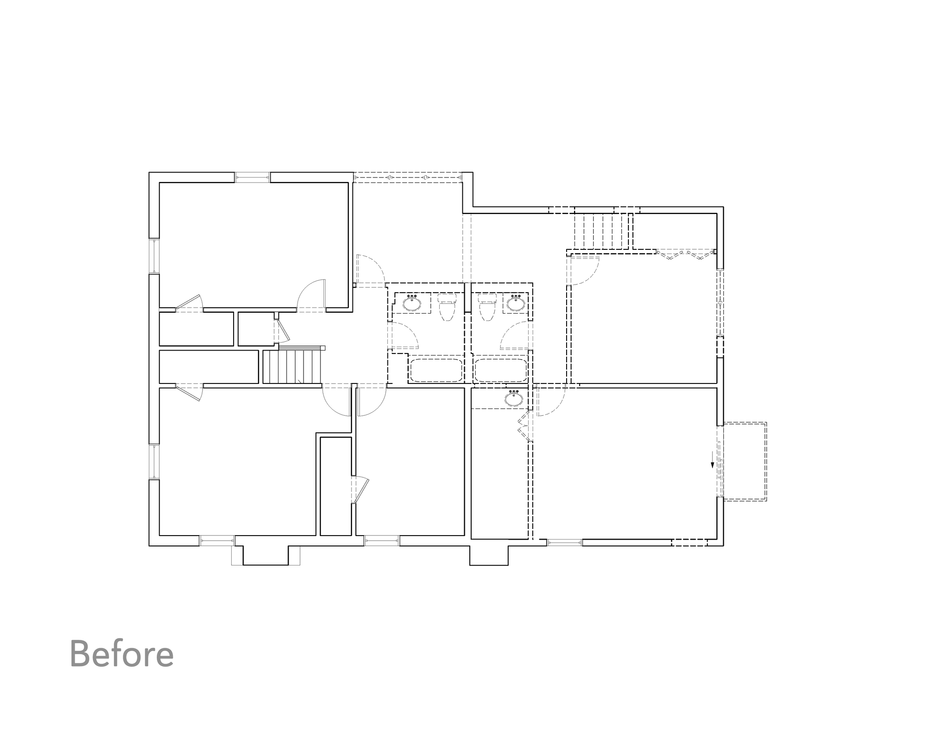 Relocating the existing kids bath to an awkward transition point in the old long winding corridor configuration was essential to open up a central hallway and directly link the stair to all of the bedrooms. The new bathroom locations provide sufficient space for a double vanity and a separate water closet in both of the new bathrooms.